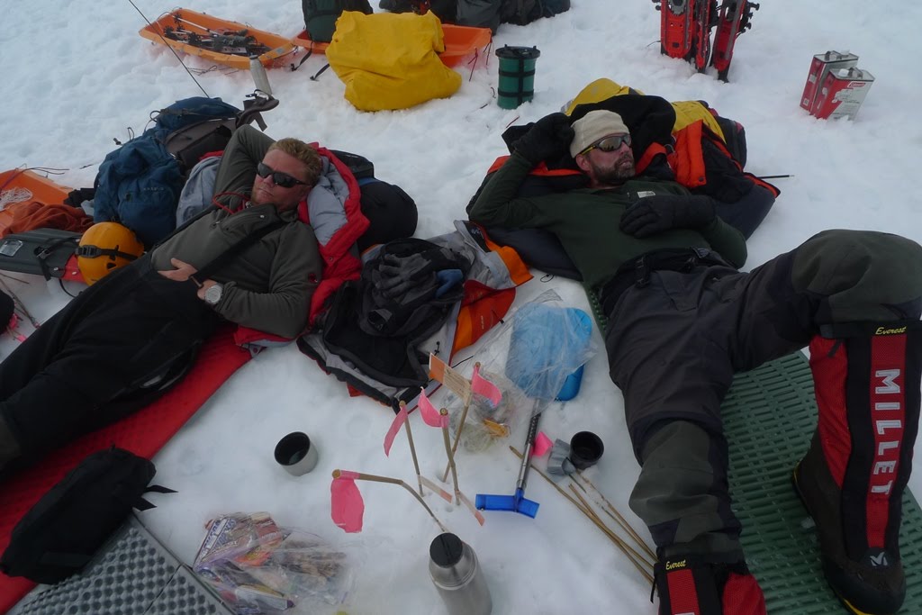 17 tunnin down hill-marssi painaa reisissä kun saavumme keskiviikkoaamuna kahdeksalta perusleiriin. 11000 jalan leiristä poimimme mukaan pulkat ja Ski Hililta kasan sinne kaivettua muonaa ja kiipeily varusteita. Unelmat toisesta noususta… hienosta linjasta, jäävät näihin maisemiin! Nyt painumme alas aamuyön kylmyydessä. Keitämme ensin tupla nuudelit ja syömme ne kaksin käsin… jemmaan hamstratut