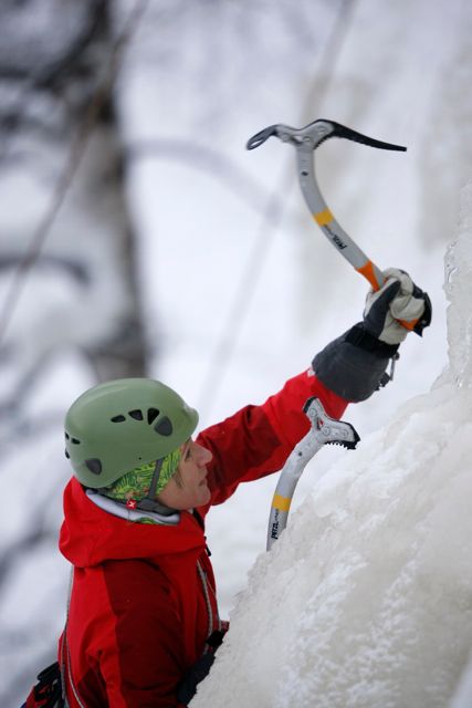 Alas siis barrikadeilta ja takaisin maanpinnalle. Olimme Loppiaisviikolla Tonin kanssa pitkästä aikaa ihan kaksistaan kiipeämässä. Olimme oikea tehokaksikko. Viritimme narun Pirunkallion korkeimpaan kohtaan ja aloimme reenata, ihan tosissaan. Kiipesimme kerta toisensa jälkeen Tonin Will Gaddin kirjasta bongaamaa kolmea eri teemaa: 1) hakut ja raudat vain ja ainoastaan valmiisiin reikiin ja jalkiksiin asettaen, ei lyöden /potkaisten, 2) mahdollisimman vähillä lyönneillä /jalan pleissauksilla ylös eli hakut ja raudat kerralla mahdollisimman korkealle lyöden ja 3) mahdollisimman nopeasti ylös. Oli ihan sairaan hauskaa! Ekaa kertaa elämässäni löysin jääkiipeilystä samanlaista muuvijumppaa ja liikkeiden rikkautta kuin kalliokiipeilystä. Suosittelen! No, tuo kolmas harkka, nopeus, jäi minulta tekemättä, sillä tässä vaiheessa kyykkätreenejä ei oikein irtoa tuota nopeutta. Harkkasession seurauksena jouduin myös muuttamaan käsitystäni jääkiipeilystä äijämäisenä ja monotonisena hutkimisena samaan malliin kuin jouduin syksyllä muuttamaan käsitystäni teknokiipeilystä insinöörismiesten gear-hifistelynä. Tuskin maltan odottaa, että pääsen hakunvarteen seuraavan kerran! Niin hienoja, minulle varsin epätyypillisiä, dynaamisia muuveja ja toisaalta niitä erittäin tyypillisiä hiipivän intiaanin släbihiippailuja tuli tehtyä, että huhhuh. Olen viimeinkin löytänyt vastavoiman jääkiipeilyyn olennaisesti kuuluvalle sormien jäätymiselle: jääkiipeilyssä on kyse muustakin kuin monotonisesta äijäpotkimisesta ja hutkimisesta. Kauanhan tämän hiffaamiseen meni, mutta siitä viis. Pääasia lienee, että olen viimeinkin, kaikkien näiden kiipeilyvuosien jälkeen, ymmärtänyt, että jääkiipeilyllä on muutakin annettavaa kuin jäätyneet sormet.