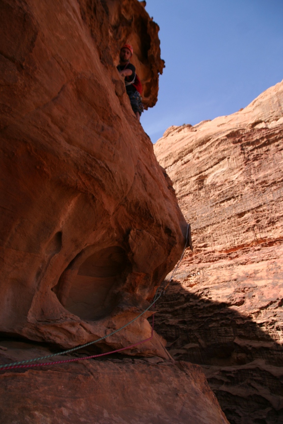 Matti vetää poikkaria Rum Doodle:lla, Wadi Rumin hiekkakivillä. Kiven laatuun ja varmistusten kestävyyteen sai suhtautua varauksella.