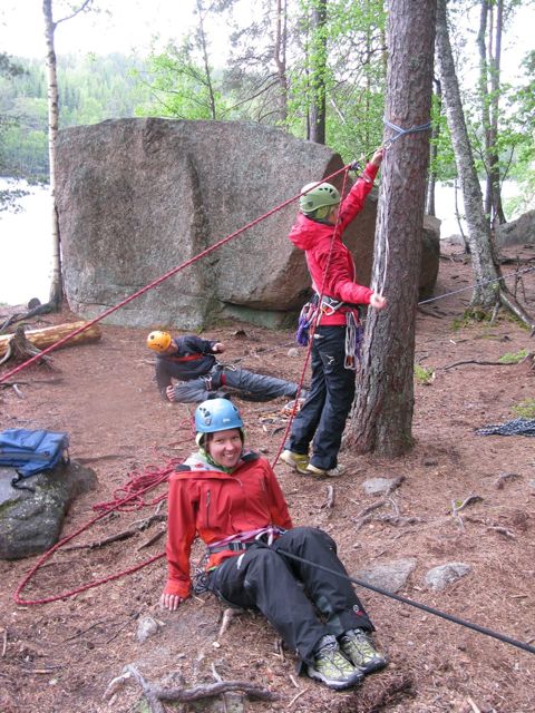 Meitä oli kouluttajien lisäksi paikalla 12 kiipeilyn ohjaajaa ja appariohjaajaa. Jakaannuimme kahteen ryhmään, joista toinen perehtyi ekana päivänä kiipeilytilanteisiin räätälöityyn ensiapuun Tonin kanssa ja toinen Josen kanssa erilaisiin kalliolta pelastamisen skenaarioihin. Ja toisena päivänä toisinpäin. Me pääsimme Sinin kanssa ekana päivänä harjoittelemaan pelastusskenaarioita autenttisissa olosuhteissa, kaatosateessa. Olosuhteet olivat siis otolliset ihan oikeille ”tilanteille”. Mieluummin olisin viritellyt naruja, prusikeja ja taljoja ilman Suomen suvelle tyypillistä korkeahkoa ilman kosteusprosenttia. Virittelemämme systeemit kuitenkin pitivät, eikä niitä todellisia tilanteita pukannut. Lisäksi opimme, että Mahtava Marineri pelastaa melkeinpä tilanteen kuin tilanteen. Jos et vielä tunne Mahtavaa Marineria, mene suoraan Josen ja Tonin pelastuskurssille kulkematta lähtöruudun kautta. Kysymys kuuluukin, miten ikinä olen uskaltanut kiivetä multipitchiä tietämättä, miten Mahtava Marineri tehdään ja missä kaikkialla sitä voi käyttää. Katso vaikka oheista kuvaa, jossa kolleegani harjoittavat sesongin uutuuslajia, puujumppaa, Mahtavan Marinerin varassa. Aivan upea solmu ja todella sulavia vatsalihasliikkeitä!