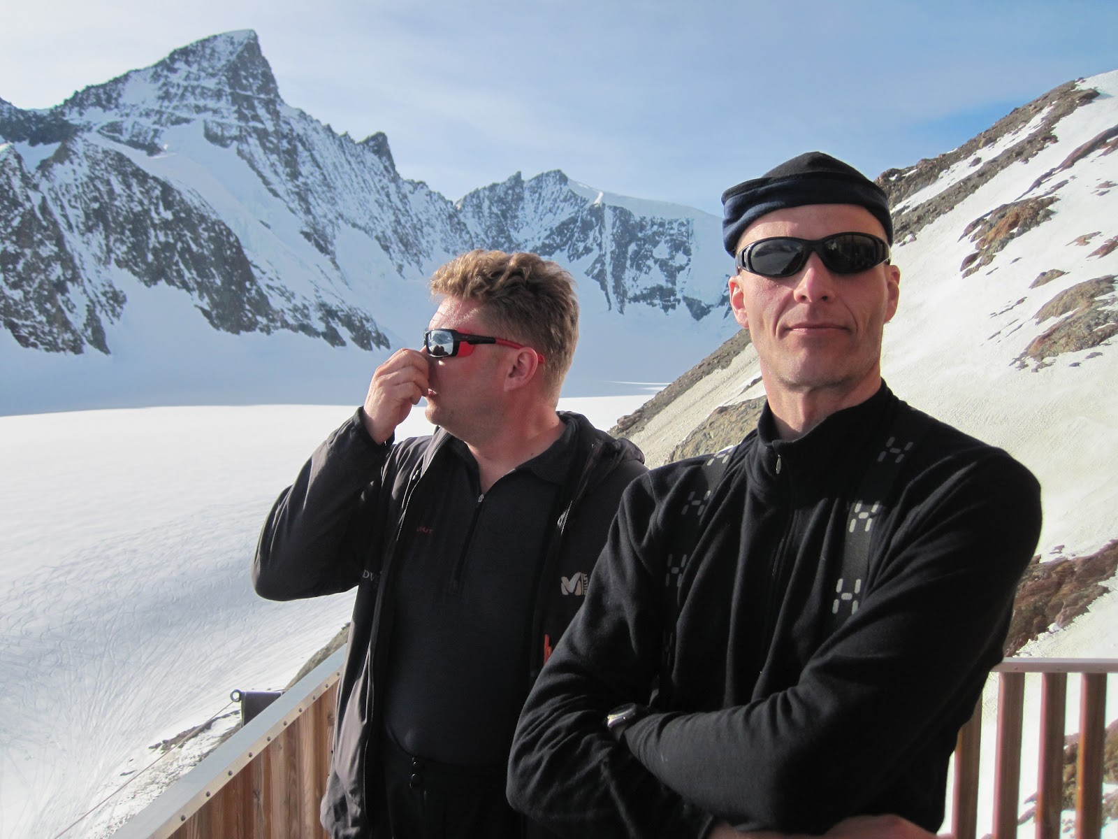 Jo Finsteraarhornilta alas pujotellessa tuulahteli pahaenteisesti. Alppilähdön sijaan aamulla pideltiinkin sitten säätä, kaksin käsin. Jossain vaiheessa parani sen verran että uskallettiin sentään livahtaa Konkordiahüttelle tapaamaan alunperin Interlakenin Hootersiin unohtutta retkueen toipilasjäsentä.