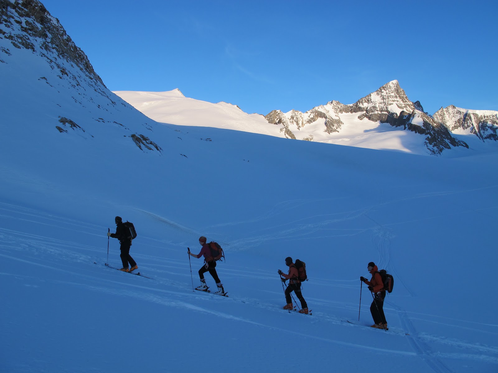 Meillä valikoitui basecampiksi Finsteraarhornhütte, muutaman tunnin rauhallisen skinnailumatkan pääsä. Tosi hieno hutte onkin; siisti, tilava, uusittu ehkä kymmenkuntavuotta sitten, fiksu punkkajärjestely jossa jokaisella on oma pieni tila ja jonkinlainen oma rauha, pätevä paskistsydeemi jne. Hutteltä käsin voi tehdä päiväreissuja lähimäille siten että muutamaan päivän reissulla ole välttämättä mitään tarvetta vaihtaa majataloa.