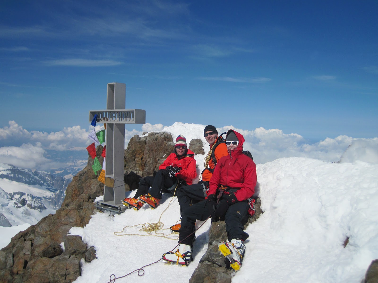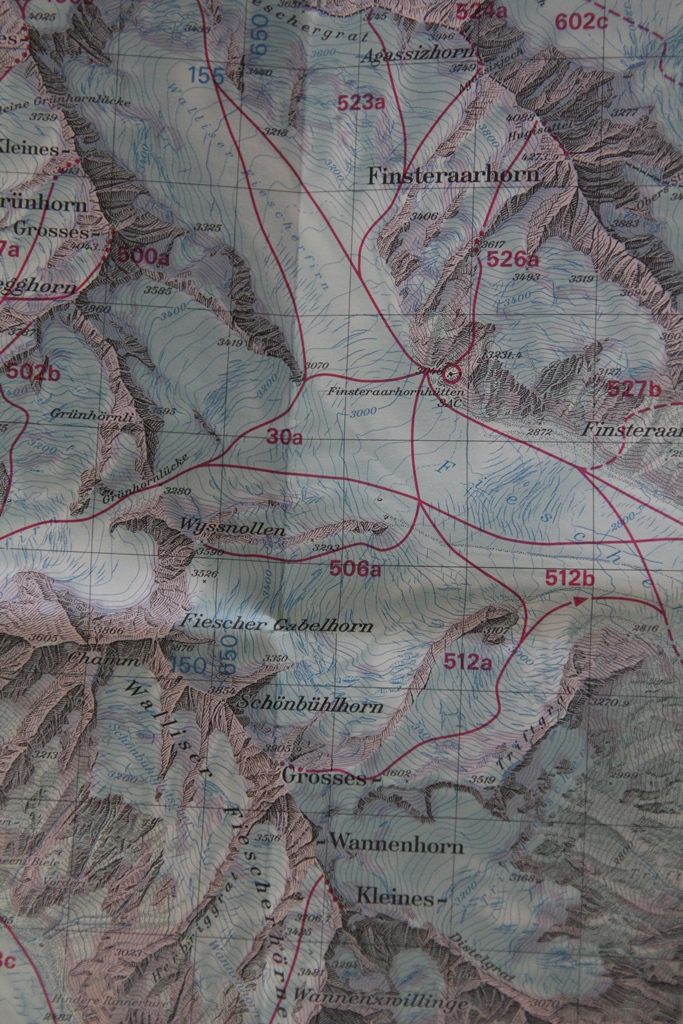 Käytiin ensin Gross Wannenhornilla, 3900m tjsp. Oikein hyvä kakkospäivän retkikohde, semmoinen seitsemän tuntia leppoisan vauhdin köpöttelyä 1300 verttimetrin verran (hyteltä hytelle siis). Hyvät oli myös laskut. Reitti on selkeä (Kartassa 512a) ja railot hyvin näkyvissä. Ei teknisiä vaikeuksia.