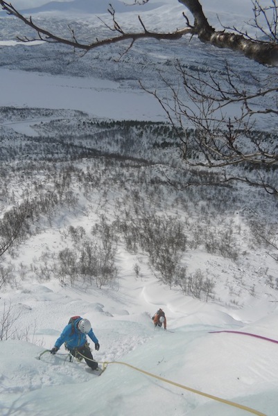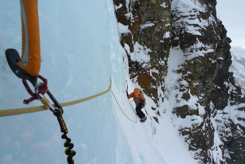 Olin jutellut aiemmin Jussin kanssa, että voisimme suunnata torstaina Stora Sjöfalletille Gällivaaran taa kiipeämään kevätjäitä. Mies (sadisti?) ehdottikin sitten tapaamista kello viideltä aamulla Aavasaksalla, mikä tarkoitti pirteää kolmen starttia Rovaniemeltä. Ulla ponkaisi eväskoreineen messiin ja lähdimme alppimaisesti vyörymään pitkin pimeitä metsäteitä kohti Ruotsia. Olimme kuulleet jo useampiakin painostavia uutisia putousten vaaleudesta niiden feissaten aikalailla etelän puolelle. Lopulta kiipesimme ekana päivänä Grevenin, joka oli kuin olikin vielä varsin hyvässä kunnossa. Sääkin oli sellainen kuin jääkiipeillessä pitää eli aurinkoinen t-paitakeli ja pehmosta helppoa jäätä. Jussi posotti lähikset suksin ja monoin ja kiikut monoin minun ja Ullan harrastaessa lumikenkäilyä. Jussin kanssa oli myös siinä mielessä nastaa kiivetä, että reenailtiin samalla kaikenlaisia alppiopastemppuja.