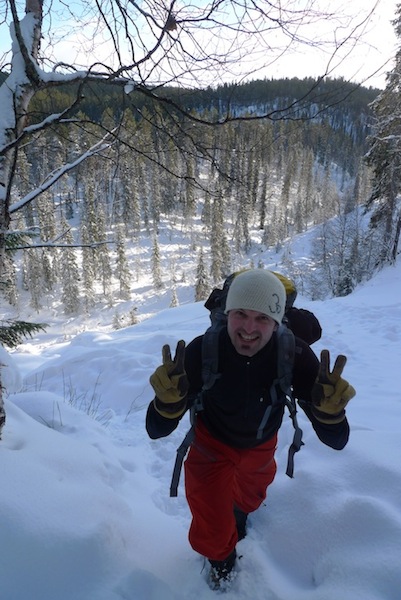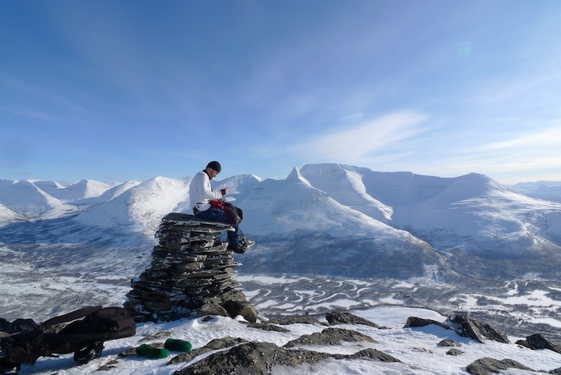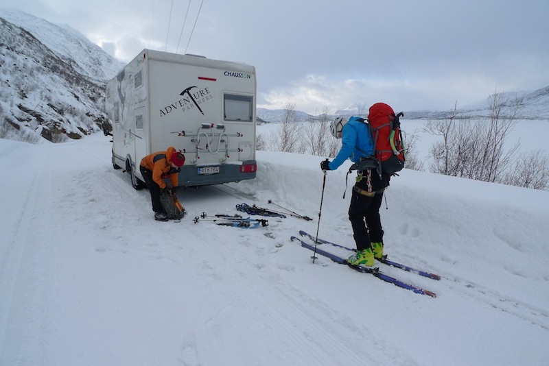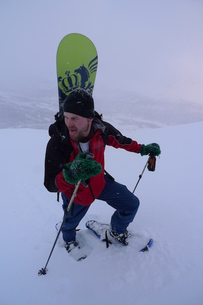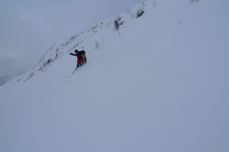Oltiin takaisin Rovaniemellä kello yhdeksän aikaan perjantai-iltana ja heitettyämme Ullan kotiin suuntasimme Juhon ja Peymanin kanssa kohti pohjoista. Matkan kohokohta oli minulla aivan uskomattoman upeat revontulet ja pojilla taas tieltä löytynyt kuollut repolainen, jota Tamokissa sitten työstettiin kohti karvalakkia. Nukuimme pari tuntia Lyngenissä ja jatkoimme Aadnen takapihalta nousevalle Mustikkamäelle. Payman harrasti lumikenkäilyn jälkeen puuteriuintia alamäkeen ja täytyy myöntää, että metsäisten lumikourujen suojassa meni meikäläinenkin mukkelis makkelis. Mutta eihän ylpeä kannata olla siitä, ettei koskaan ole kaatunut vaan siitä, että on aina noussut ylös.