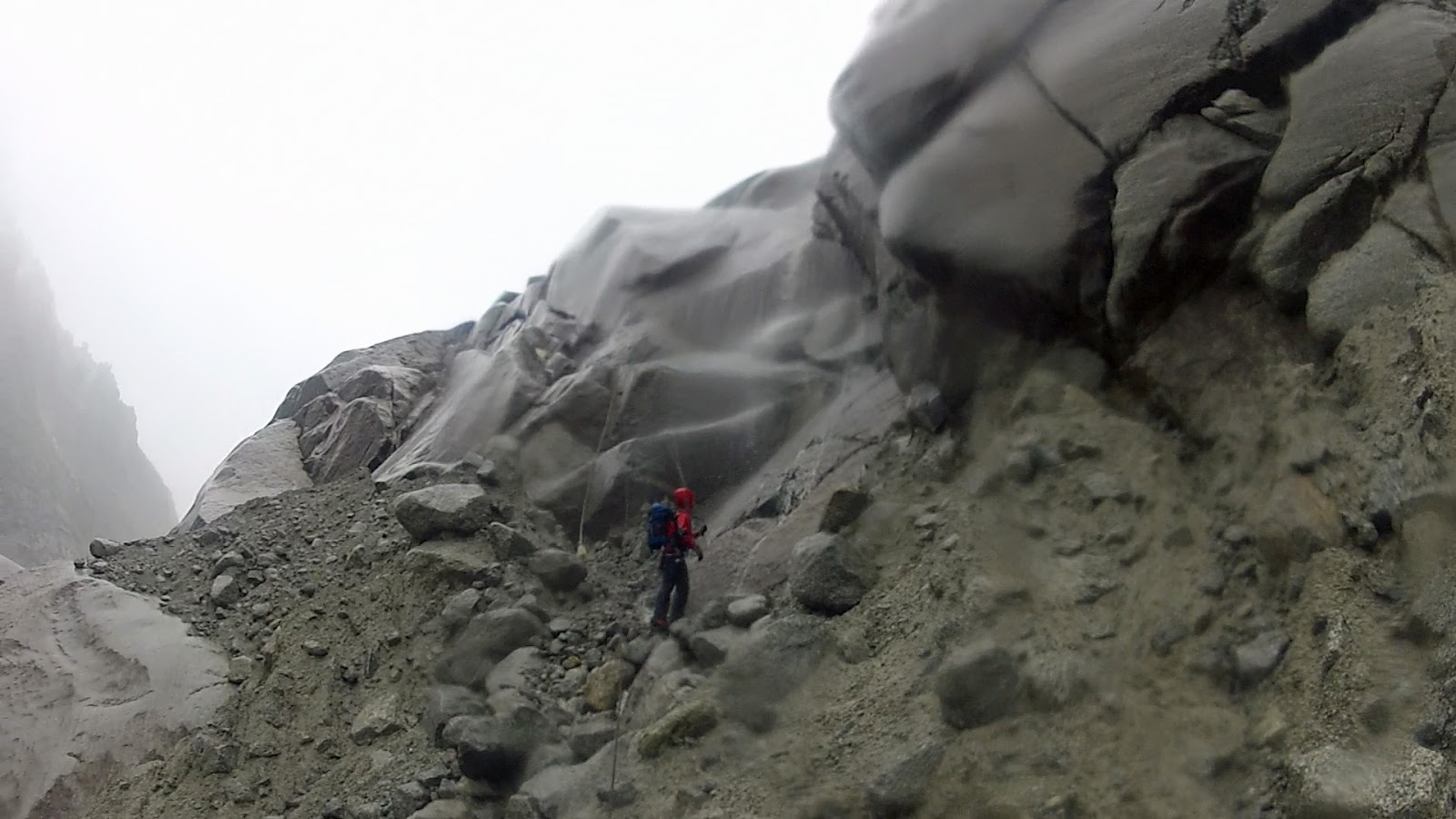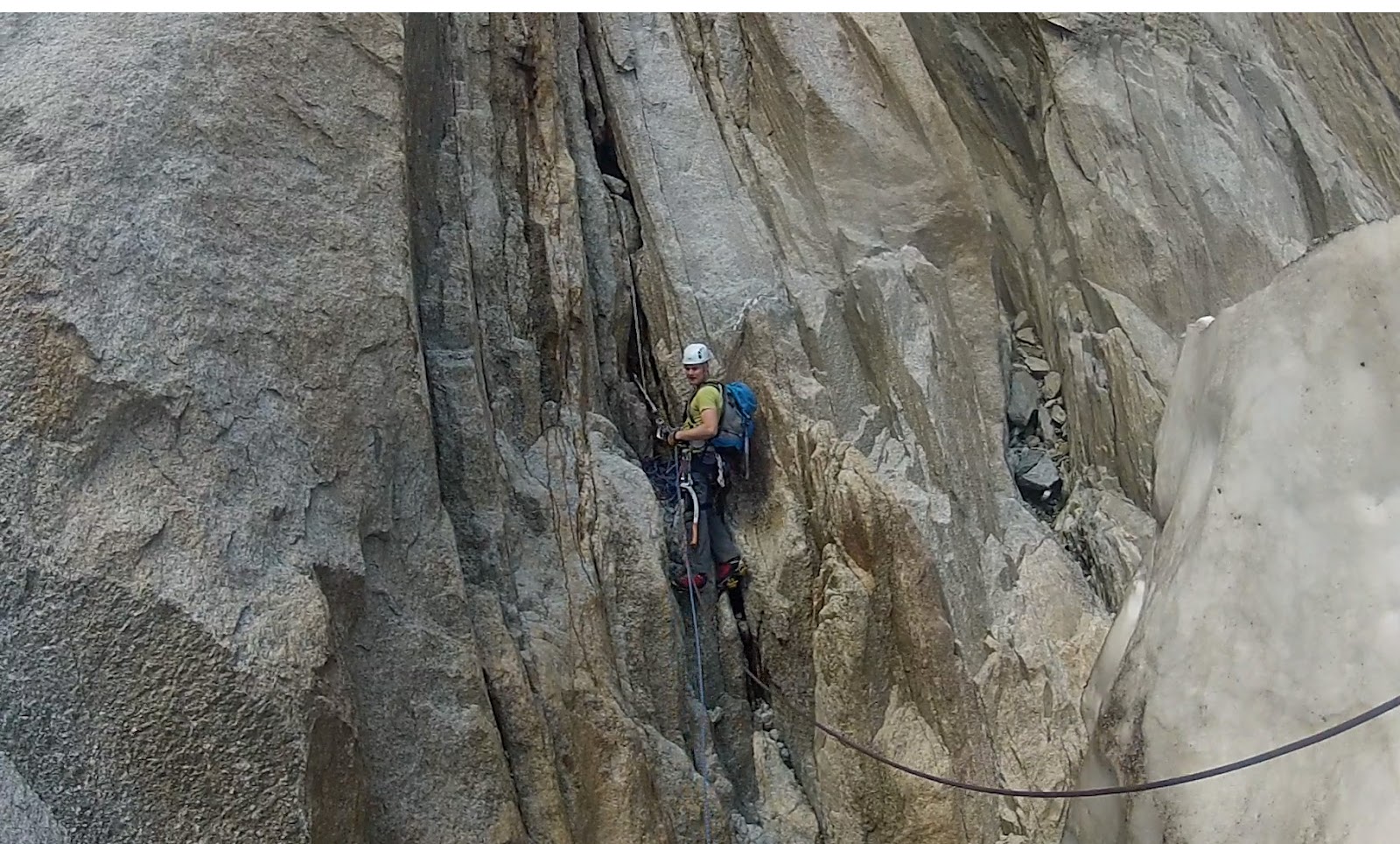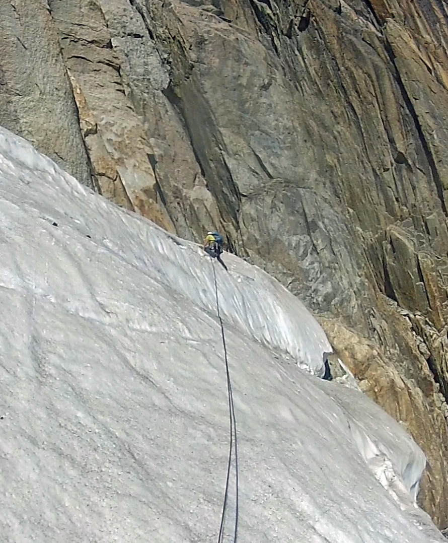 Kulttuurille menetetty aika piti kuitenkin kiinni ajaman, ja niin oltiin sitten sitten ristoreippaina reput tanassa venaamassa aamun ensijunaa. Steissillä maleksinut Tatu mutisi jotain Suomalaisten alppituristien tunnistamisesta repun koon koon perusteella – mistä ja kenestä lie kaveri puhunut… Jose oli tosiaan keksinyt että Aiguille de Rocin Pilier S (500m TDeistä halkeamaluomuilua) voisi olla sopivaa puuha, ja jo pelkästään viiden tunnin ja kilometrivertin lähestyminen riitti vakuuttamaan suuren osan retkikuntaa ajatuksen erinomaisuudesta. Noin Korouoman kokoisen reunarailon, … ”ylityksen”… jälkeen retkikunnan skeptisinkin oli myyty.