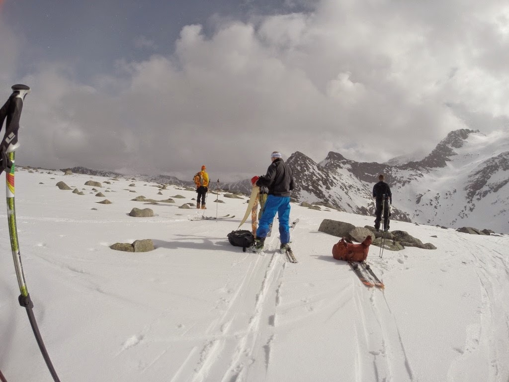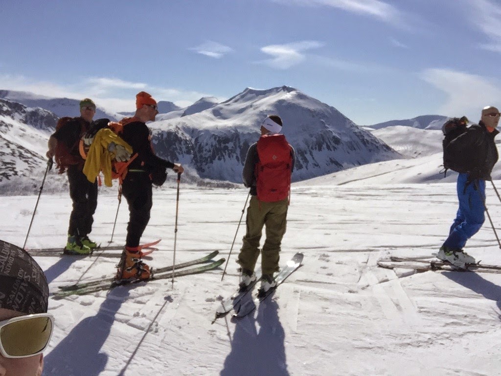 Lauantaina vuorossa oli sitten yksi pääkohteistamme, Storstolpan joka sijaitsee saaren pohjoisosassa. Nousu tieltä Humpenin ja Rundheian välistä ja pikku lasku alas vuorijärvelle josta plus 30 asteista nousua käytönnössä ylös asti. Taas oli nousuraudat paikallaan. Toppia lähestyttäessä reissun ensimmäiset pilvet ilmestyivä valitettavasti paikalle ja päätimmekin olla riskeeraamatta ansaittua laskua. Noin 100 verttiä jäi nousematta toppiin, mutta ainakin näimme laskea alas. Erittäin suositeltava kohde, joskin olosuhteet voivat olla haastavat jos rinne on kovin jäässä. Lauantain saldo on reilu 800m ylämäkeen.