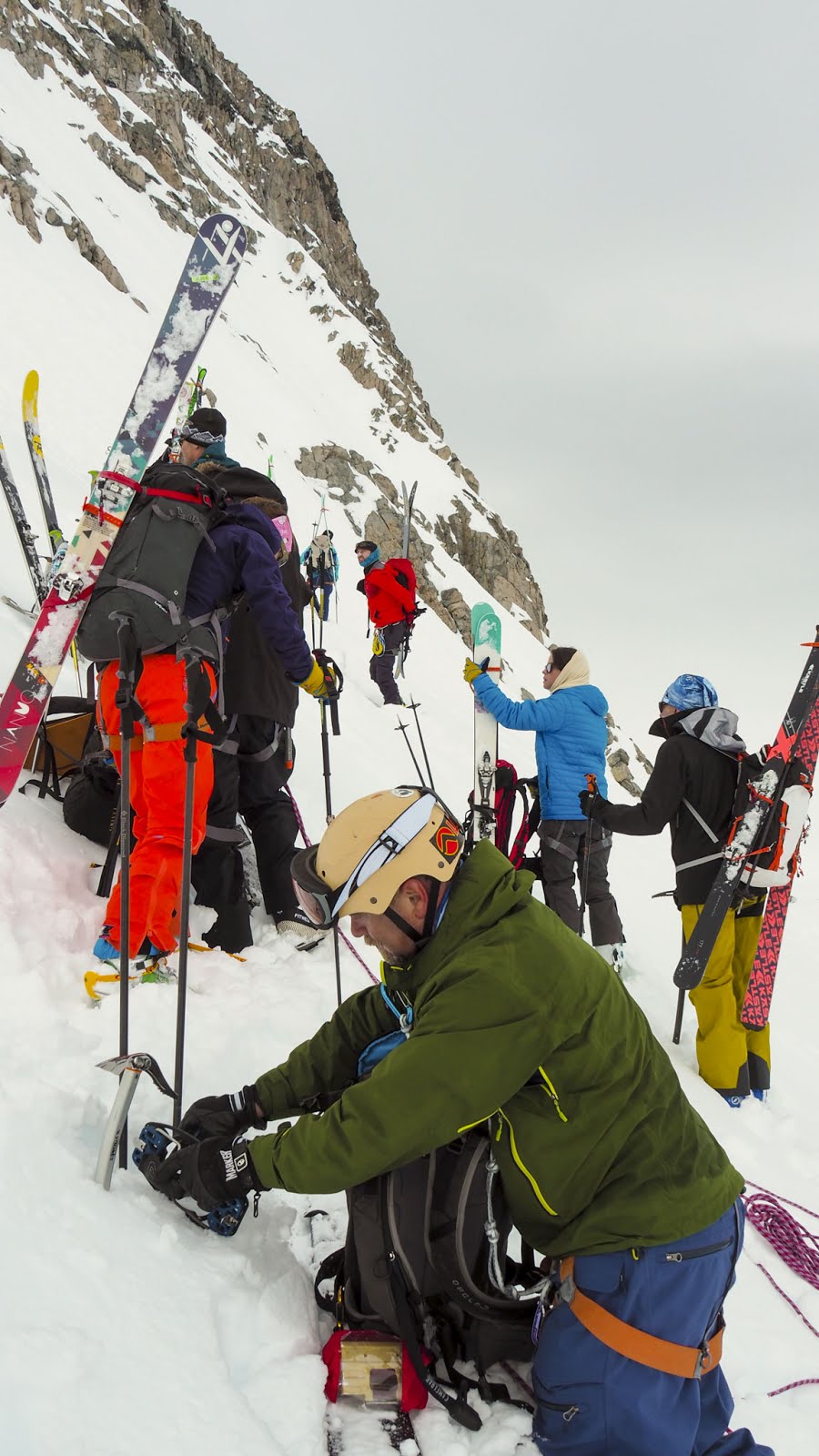 we skin up and stay roped as long as we switch on to the skiing mode to make
