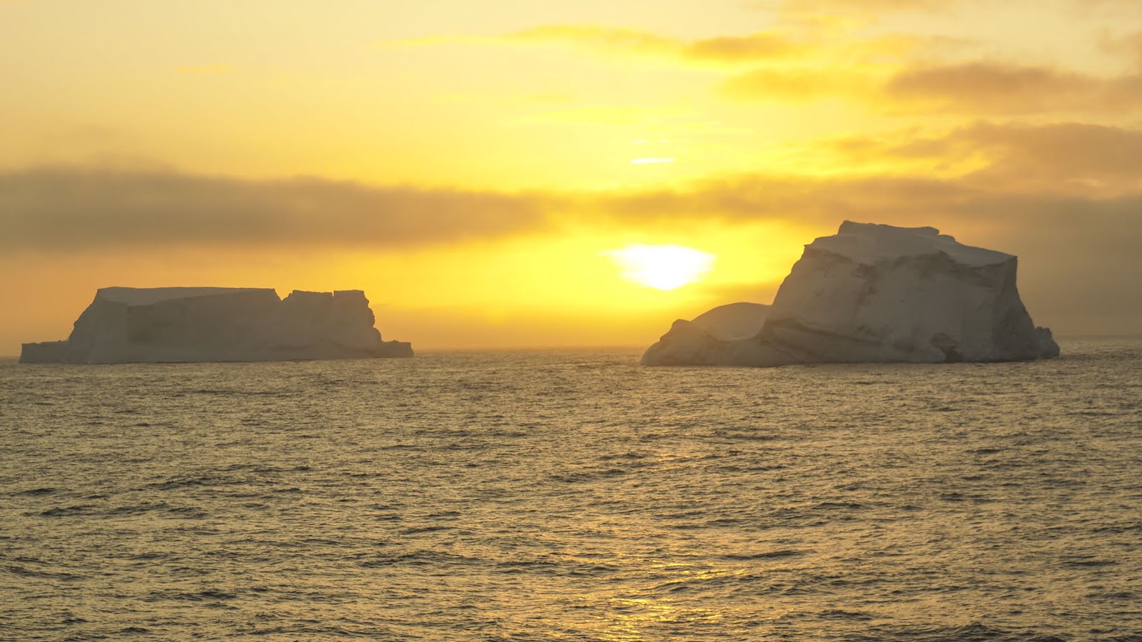 continent enjoying a beautiful sunset with some magnificent icebergs.